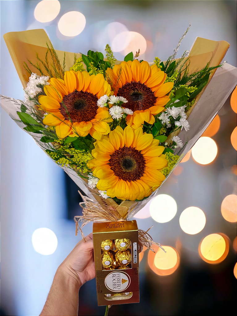 Buquê com 3 Girassóis e Ferrero Rocher com 8 unidades ou Chocolate Cacau Show